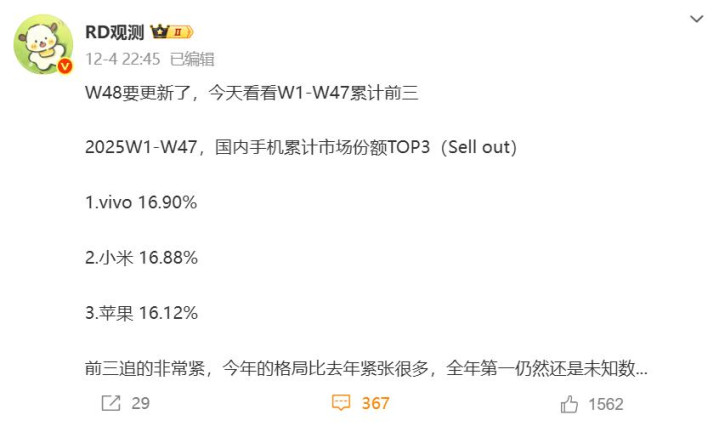 据RD观测统计的数据显示,2025年W1-W47国内手机累计市场份额排名前三的分别是vivo、小米和苹果,vivo占比16.9%排名第一比苹果还要高一些。