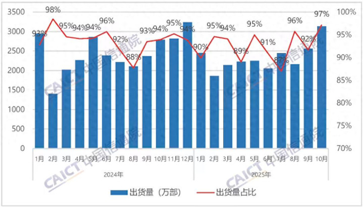 1-10月期间,国内市场手机出货量达到2.52亿部,同比也有0.8%的增长,5G手机同比增长1.3%,是出货量的主力。